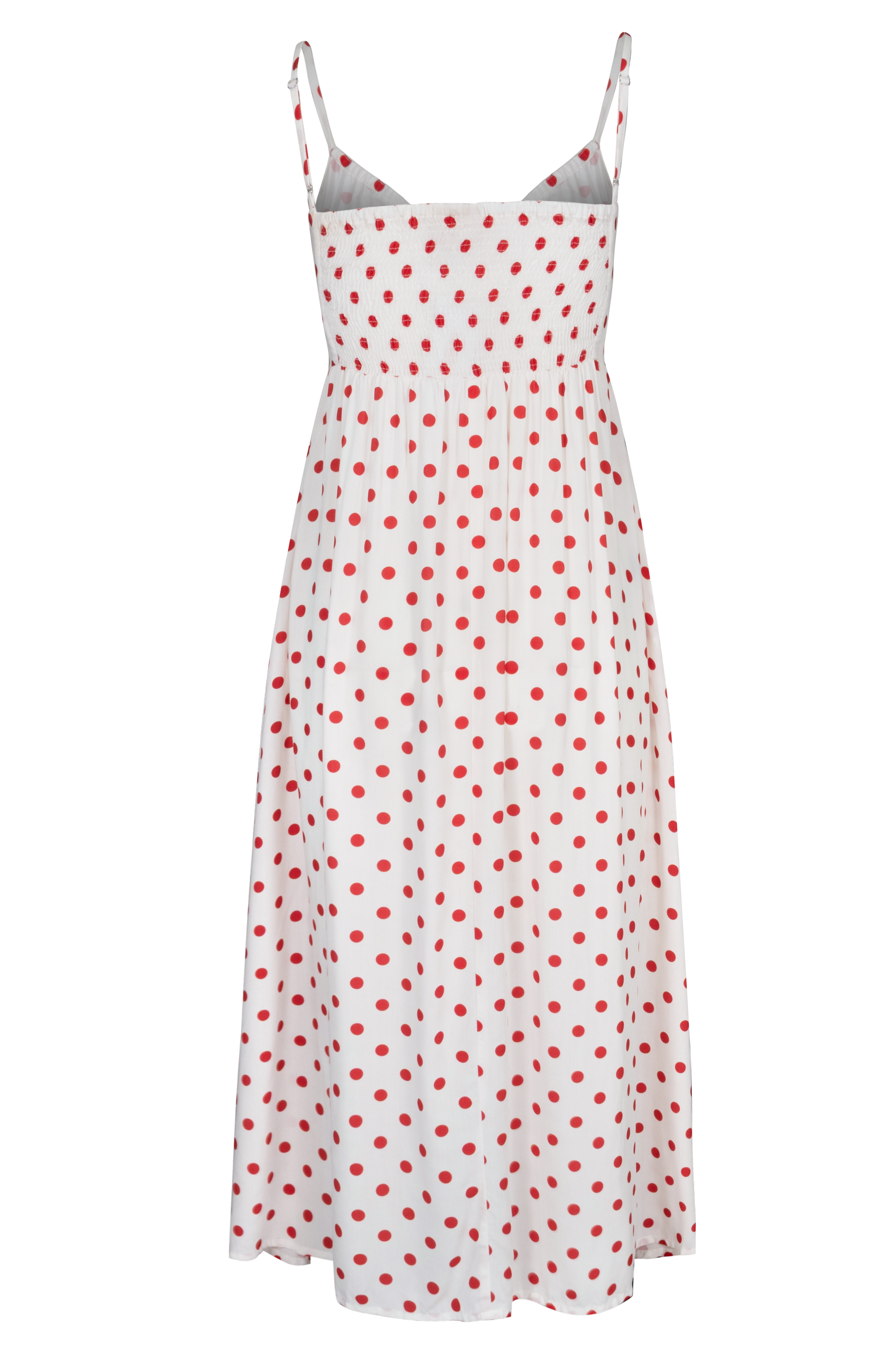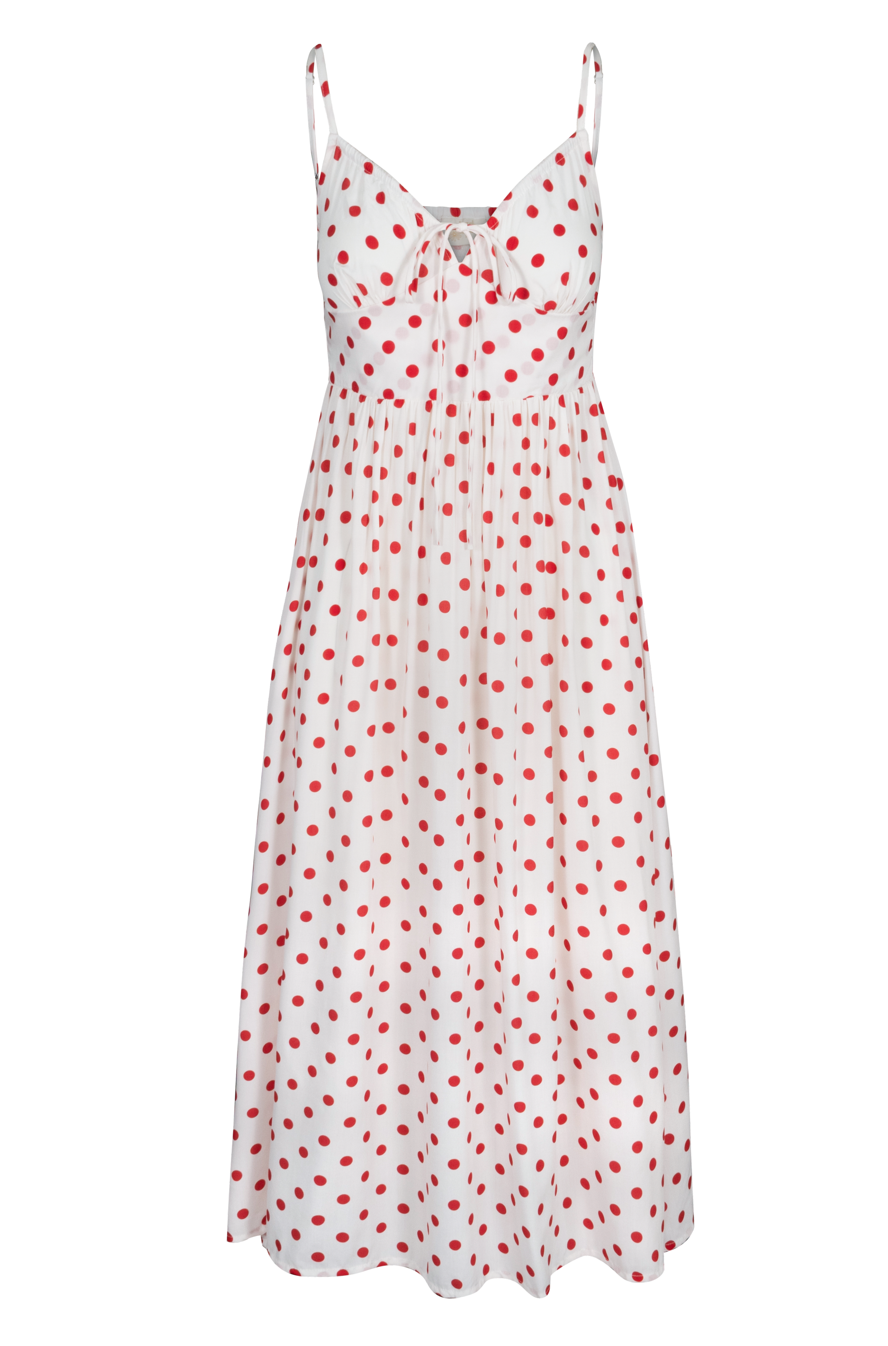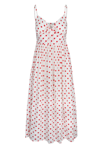 A dreamy maxi dress with a soft flowing skirt and romantic tie front bust. As seen here in our Berry Dot print.