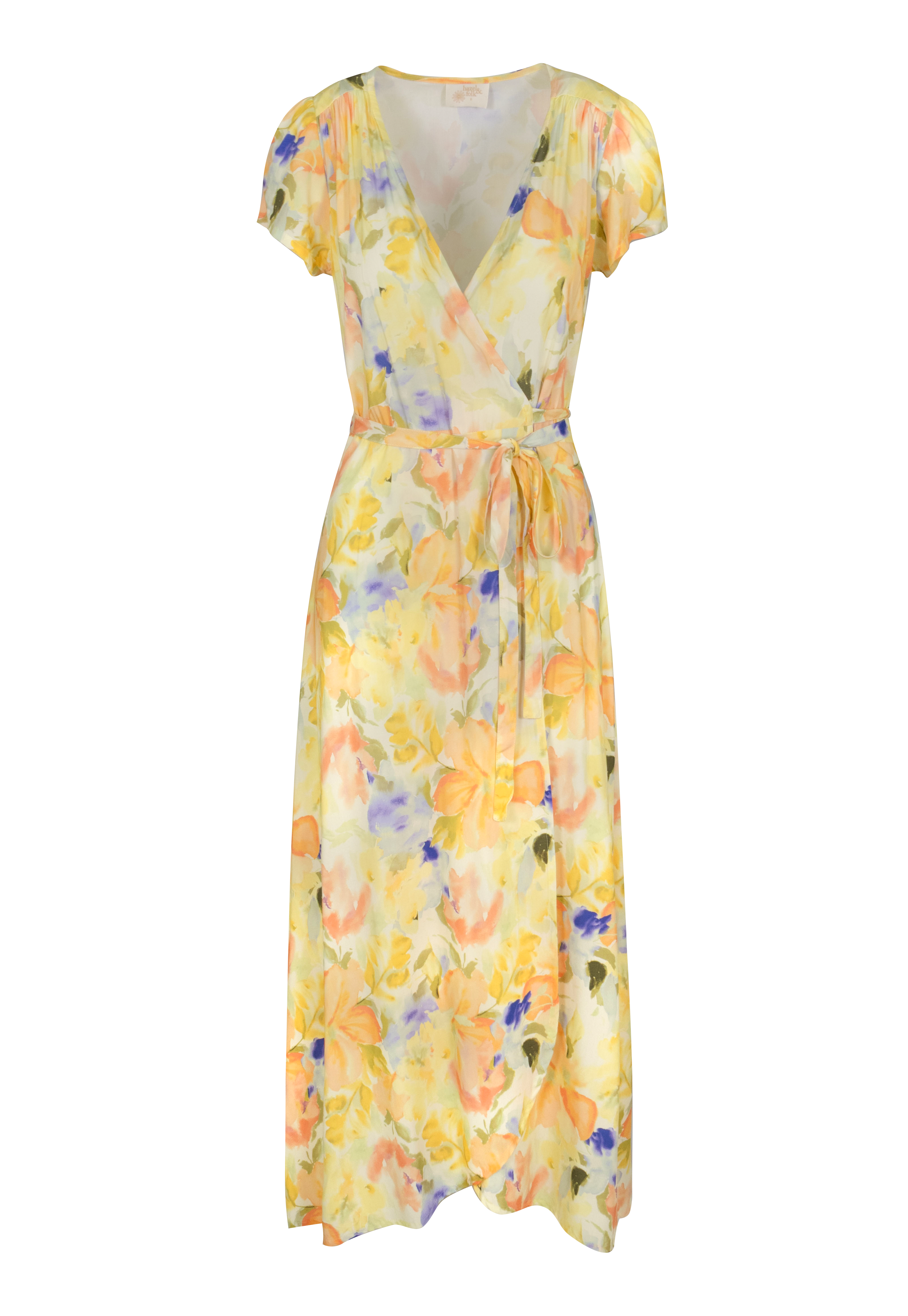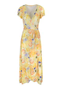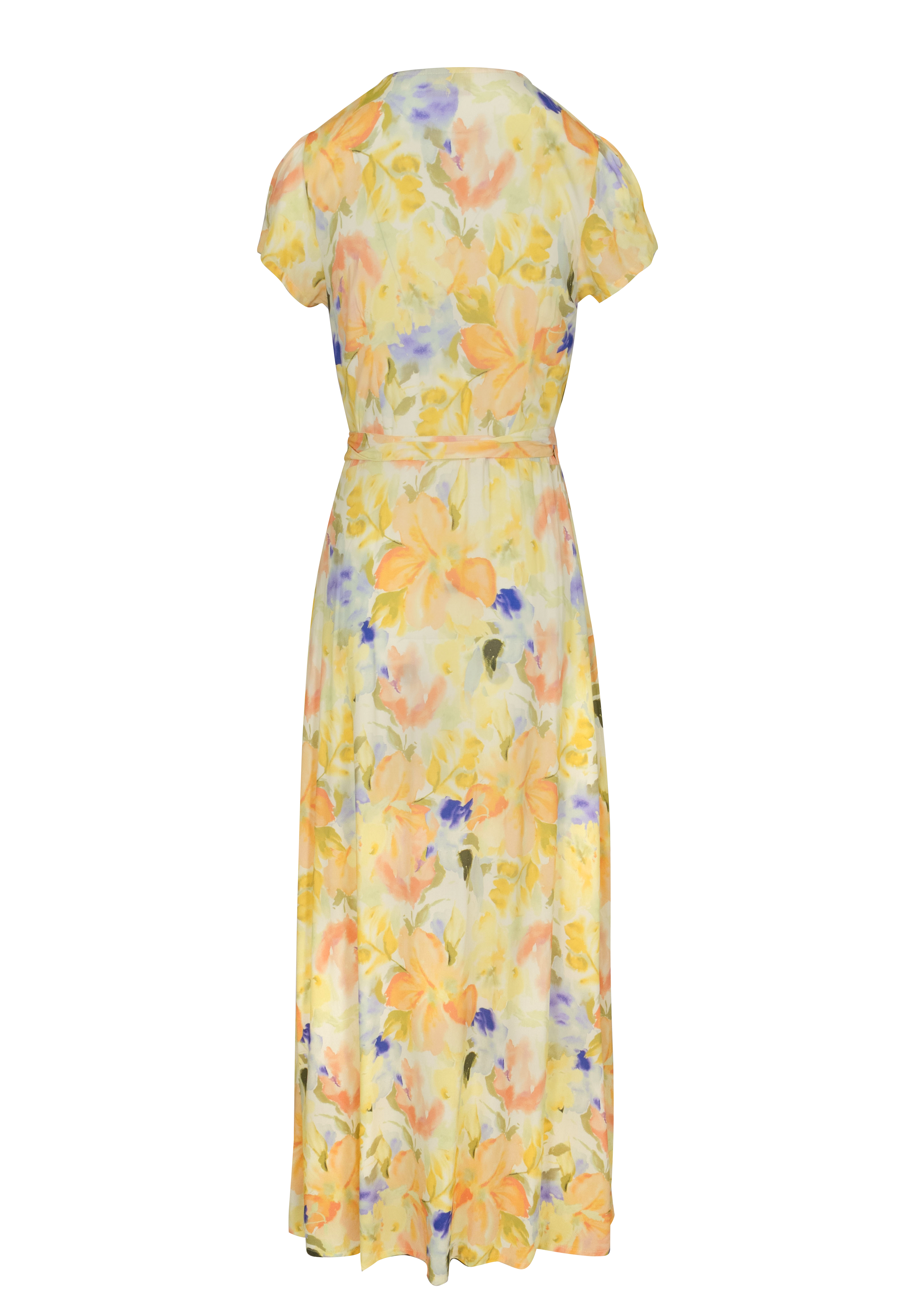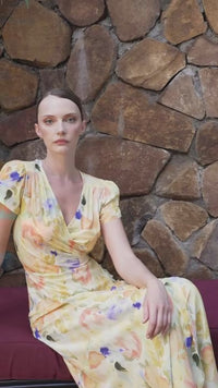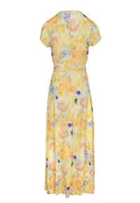 Our best selling Alexa Maxi Wrap Dress is a classic silhouette that features capped sleeves with gather details and adjustable waist wrap ties. As seen here in our exclusive Yellow Flower print.