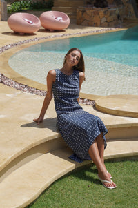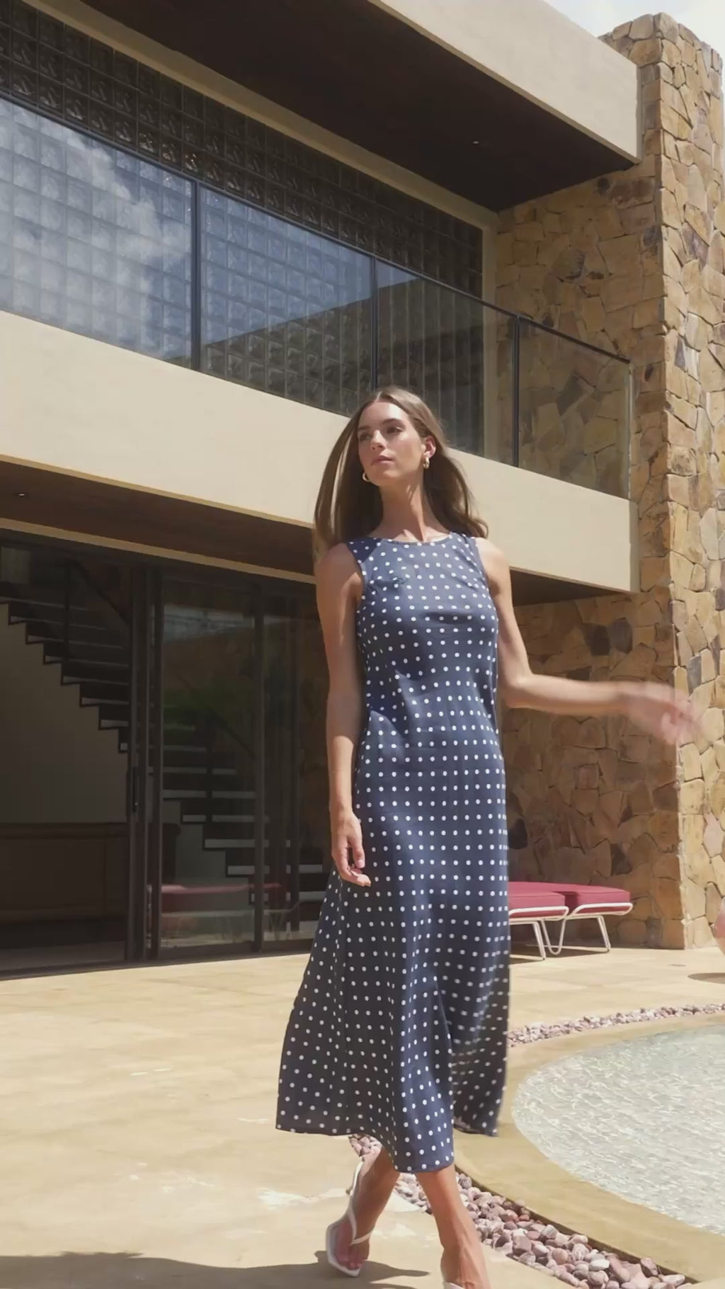 Our Ivy Midi Dress is cut on the bias to create a flattering drape and to enhance natural movement. Our timeless polka dot print is elevated by the fluid silhouette, creating an effortless balance of daytime charm and evening elegance.